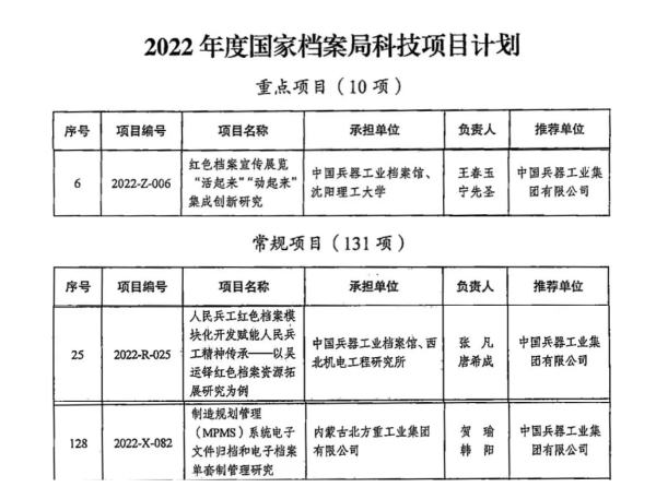為深入貫徹落實《“十四五”全國檔案事業(yè)發(fā)展規(guī)劃》要求,著力提升檔案科研自主創(chuàng)新能力,根據(jù)《國家檔案局辦公室關(guān)于開展2022年度國家檔案局科技項目立項工作的通知》要求,中國兵器工業(yè)集團檔案館(以下簡稱檔案館)依據(jù)《2022年科技項目立項選題指南》,組織各單位申報成功三個檔案科技項目在國家檔案局立項,其中一個項目為國家級10項重點項目之一,排名第六,這是繼2021年在國家檔案局首次立項三個項目后的又一重大突破,標(biāo)志著兵器工業(yè)檔案科研工作邁上新臺階。